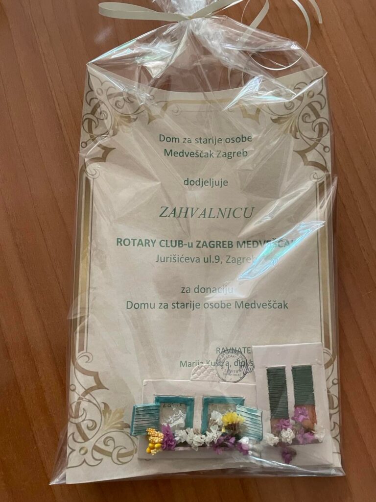 Ravnateljica Doma za starije osobe Medveščak, Marija Kuštra ovim putem još jednom zahvaljuje Rotary Clubu Zagreb Medveščak na donaciji koja će uvelike olakšati skrb o korisnicima Odjela pojačane njege i medicinske rehabilitacije Doma za starije osobe Medveščak.