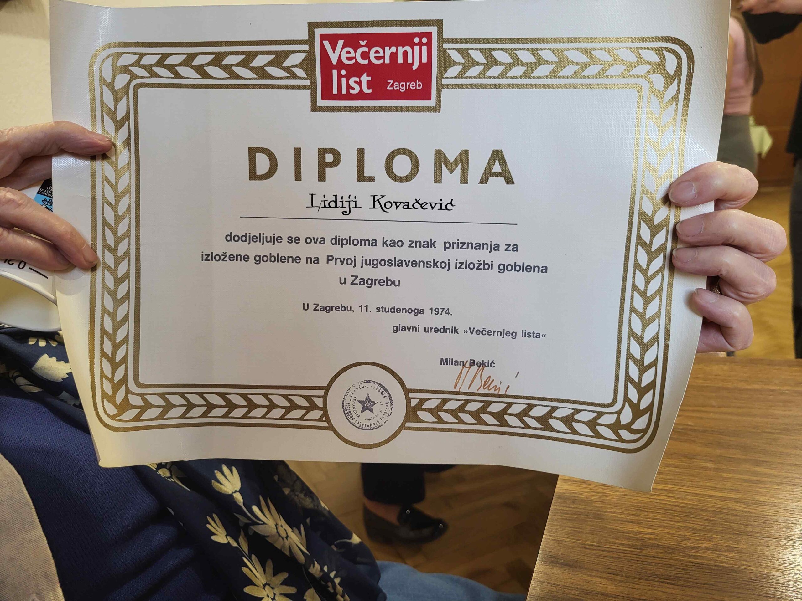Igla, konac i pokoja pisanica ime nove izložbe naše korisnice Lidije Kovačević. Korisnica Kovačević nam se pohvalila i diplomom sa prve izložbe goblena održane davne 1974. godine u tadašnjoj državi.
