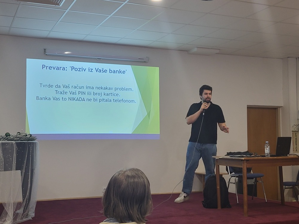 Predavanje koje je za naše korisnike održao student FER-a, gospodin Luka Sekušak. Korisnici su obnovili gradivo i zasigurno čuli nešto novo. Luka je svakako apelirao na što točno korisnici trebaju pripaziti jer su prevare, pogotovo starijih osoba, učestale putem mobilnih uređaja i/ili putem interneta.